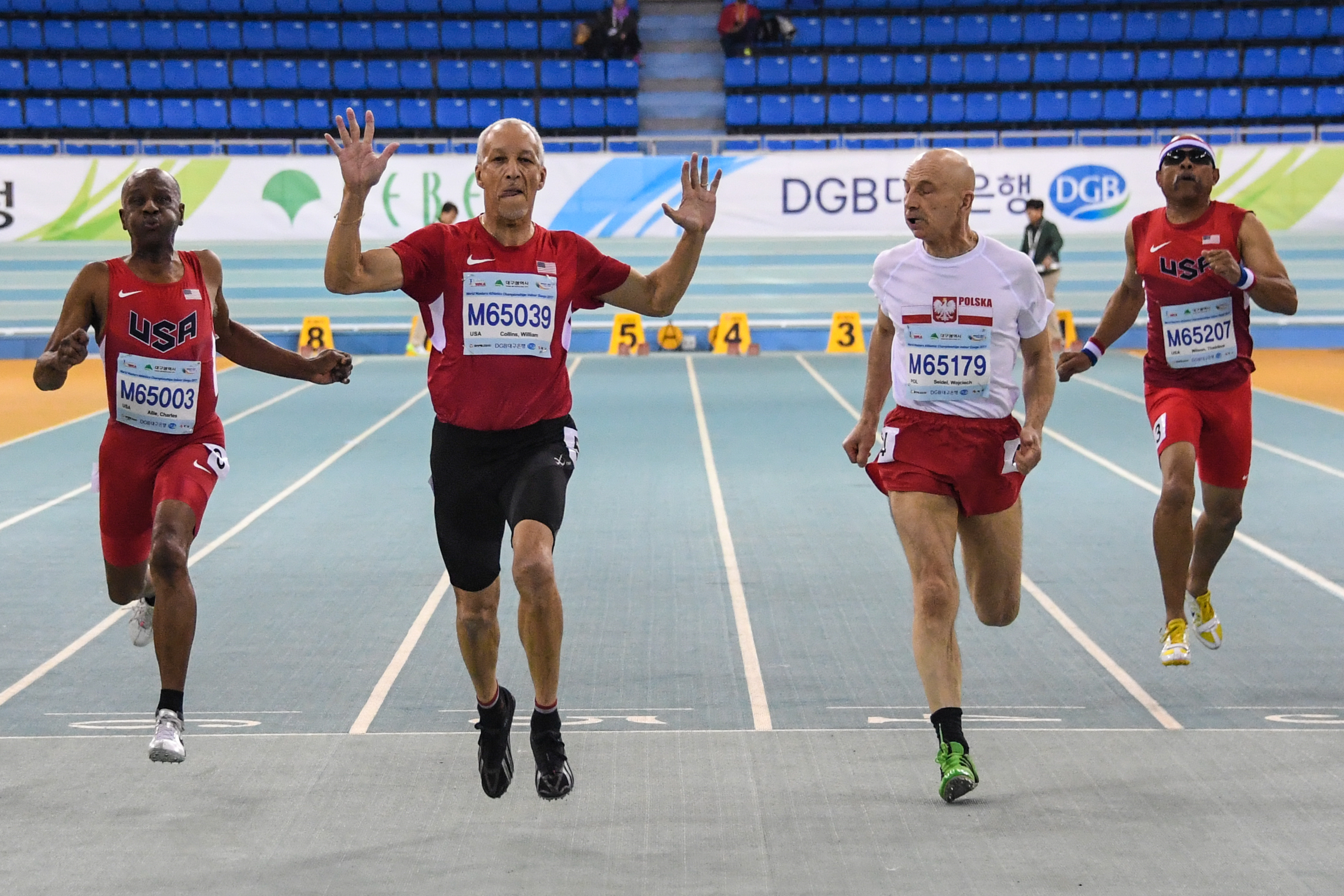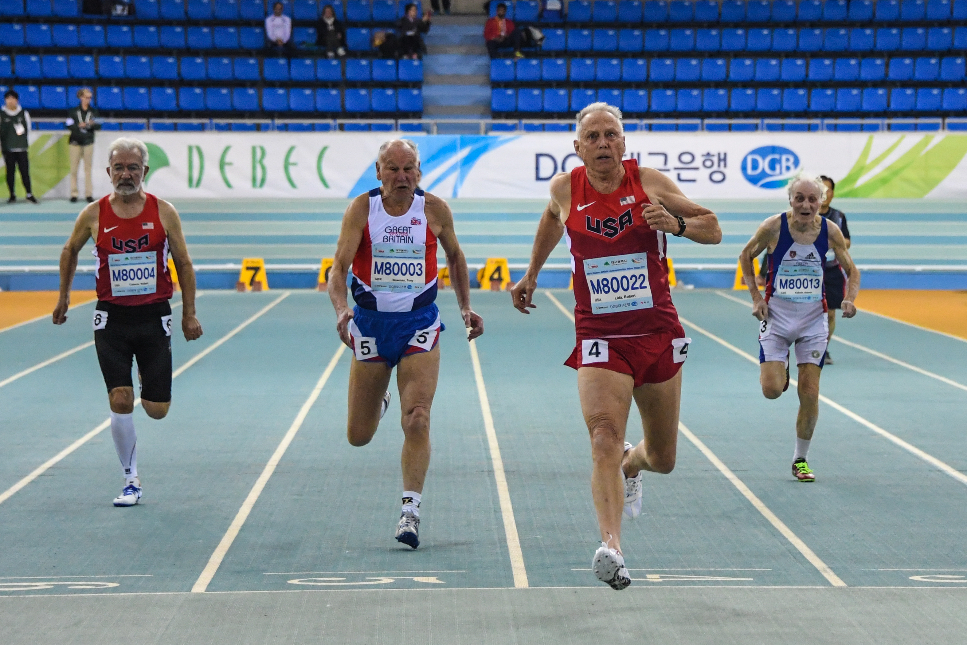Thad Wilson silver medal at M65 60 meters at Daegu, South Korea