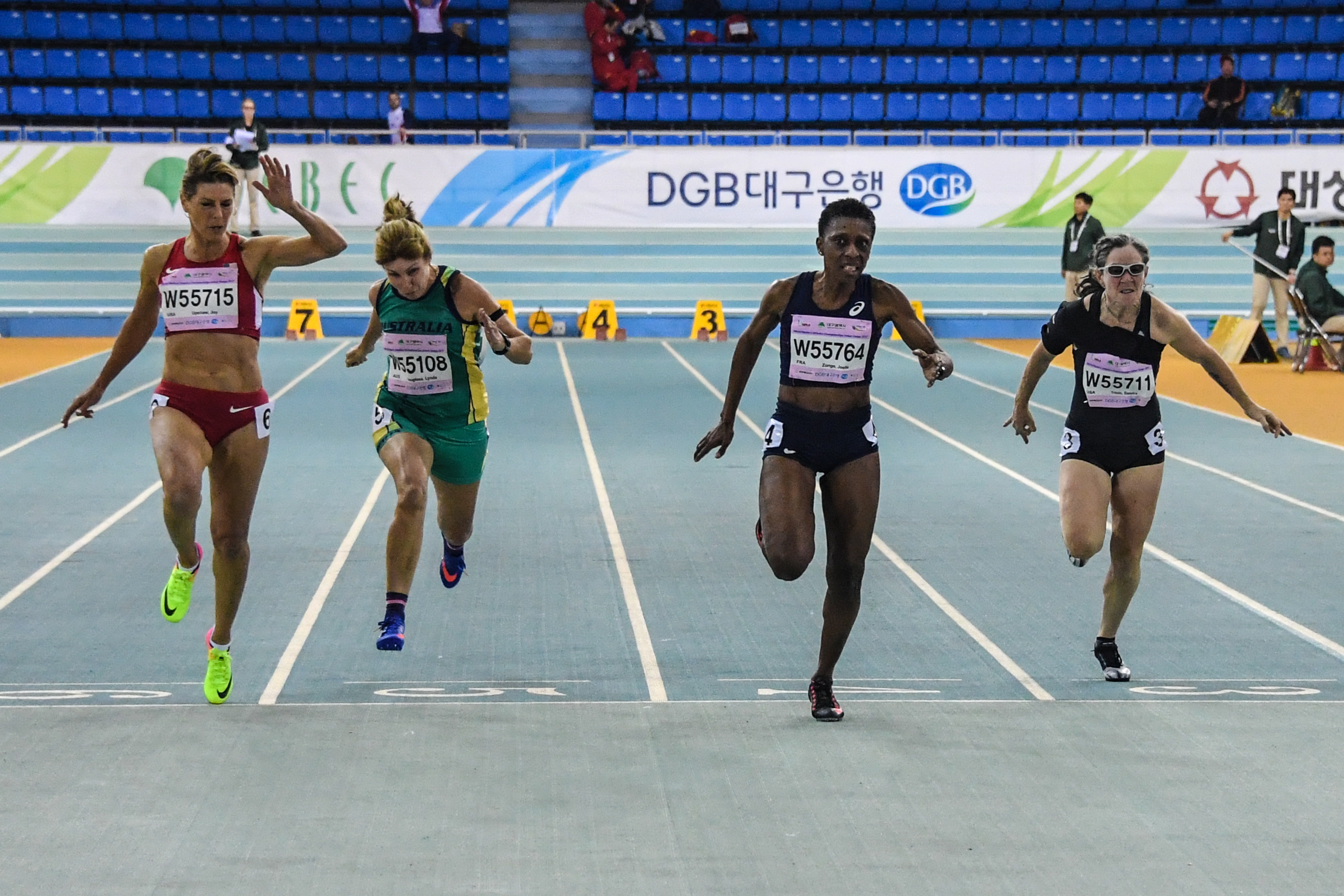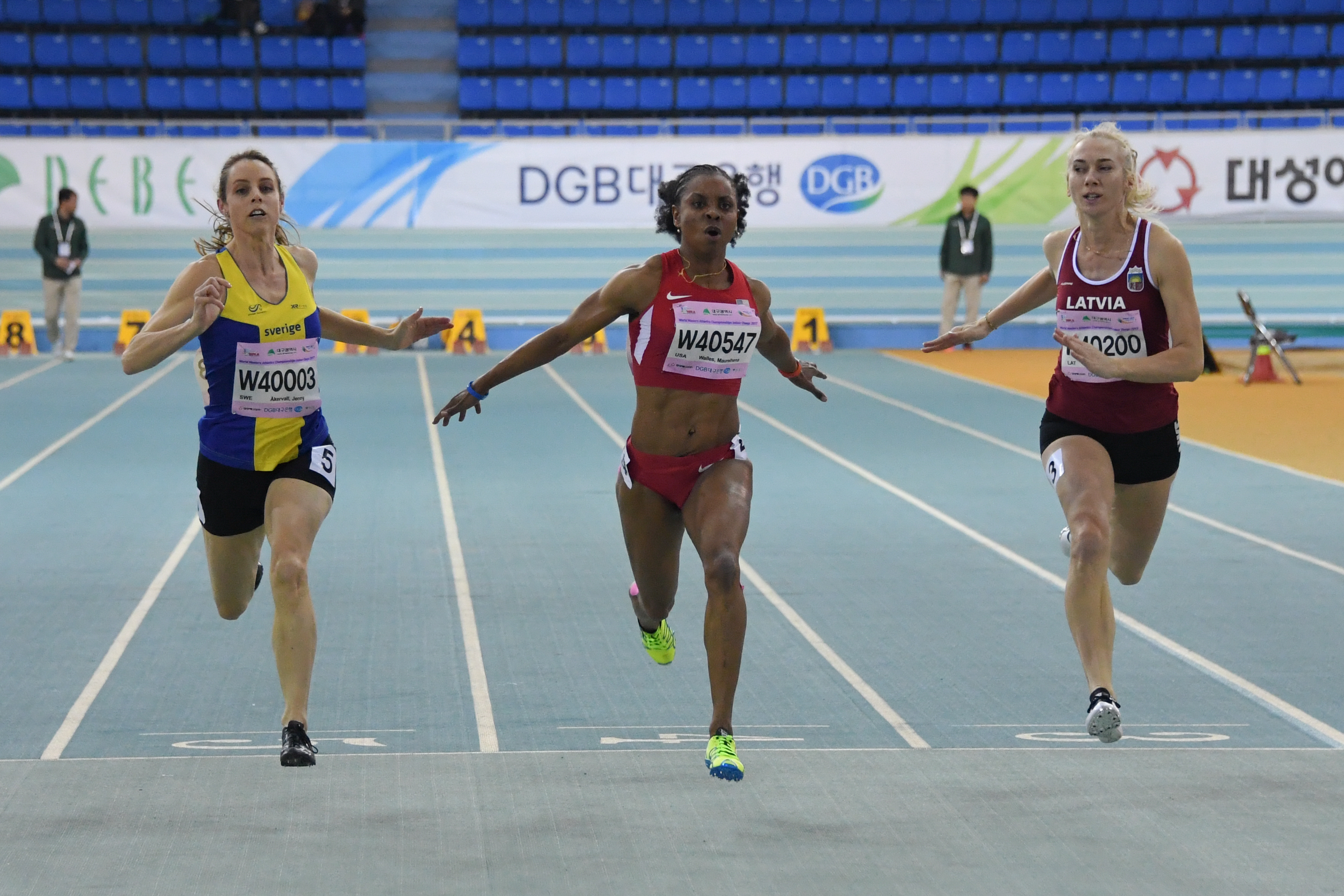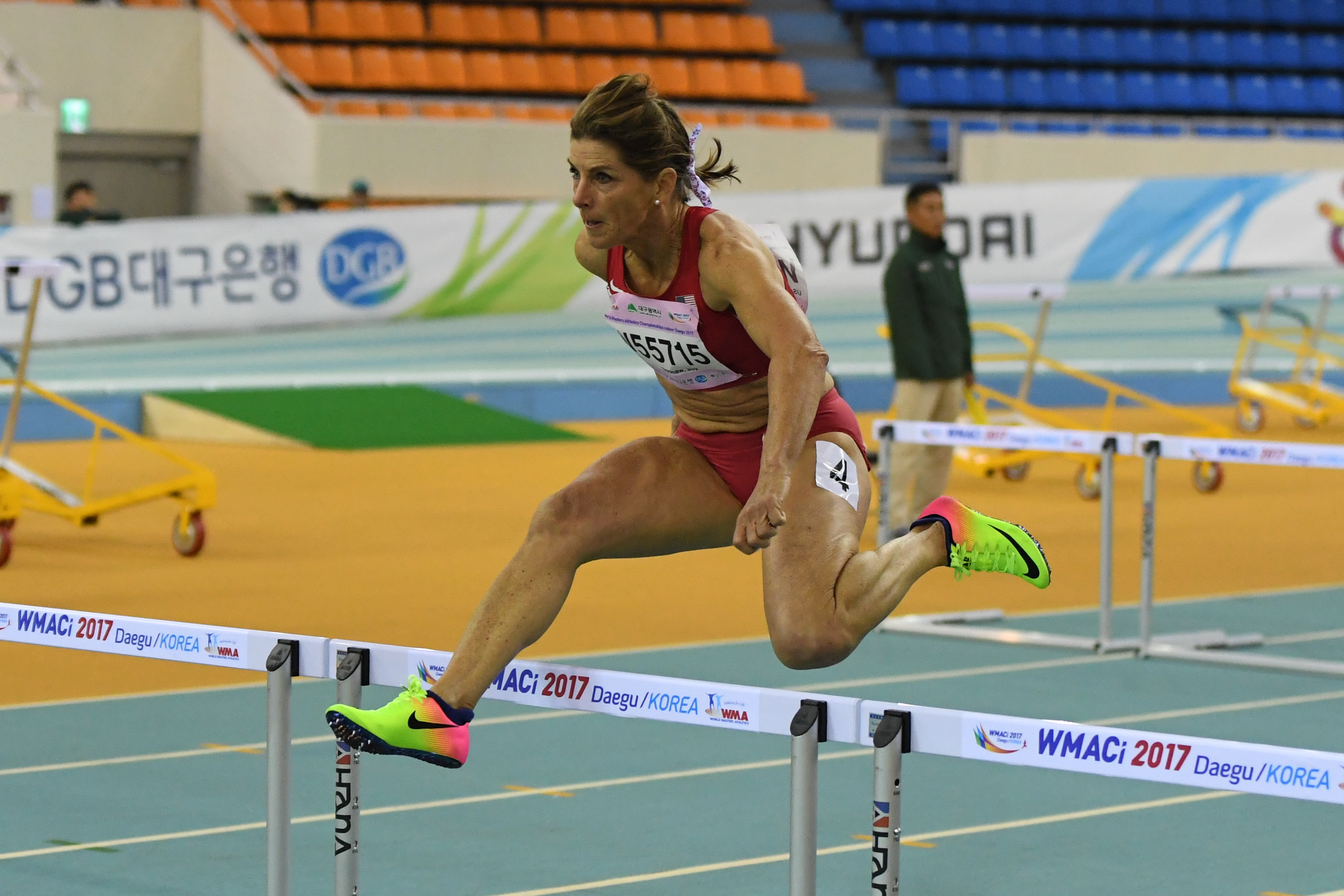 Joy Upshaw silver medal at W55 60 meters at Daegu, South Korea