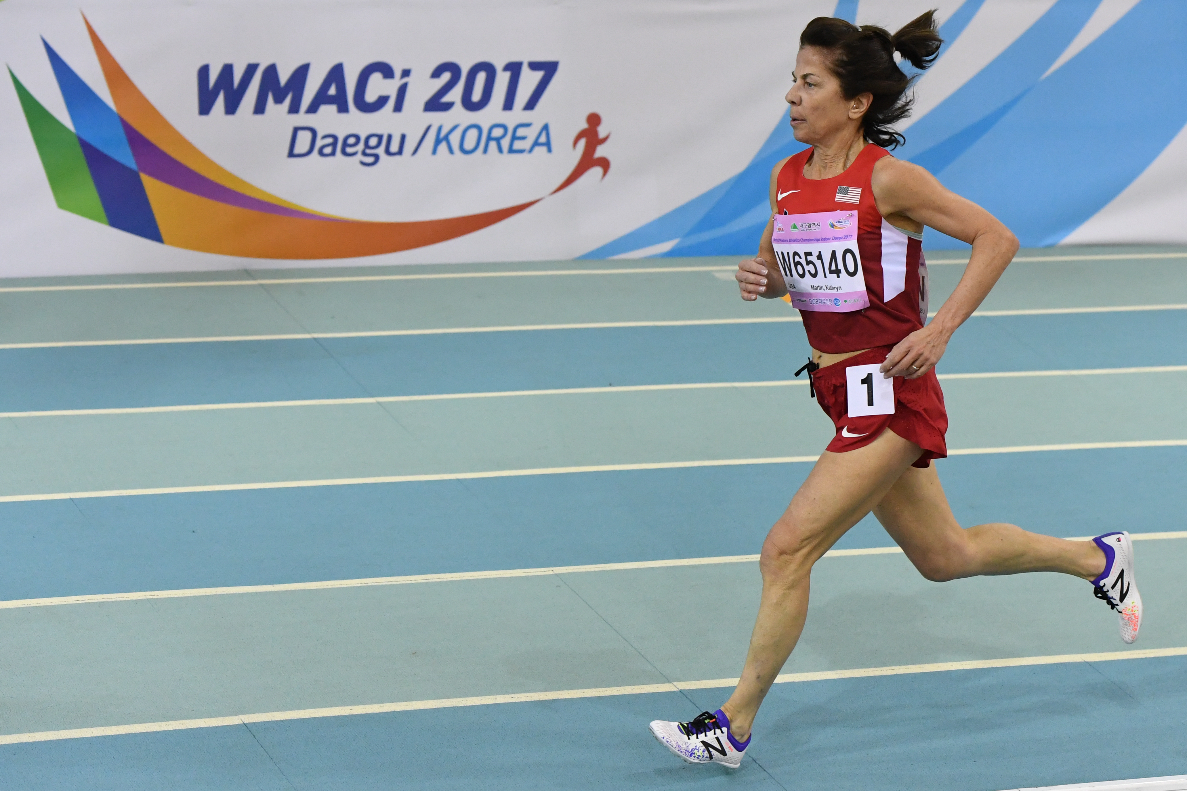 Kathy Martin setting 3000 meters W65 world indoor record of 11:35.98 at Daegu, South Korea
