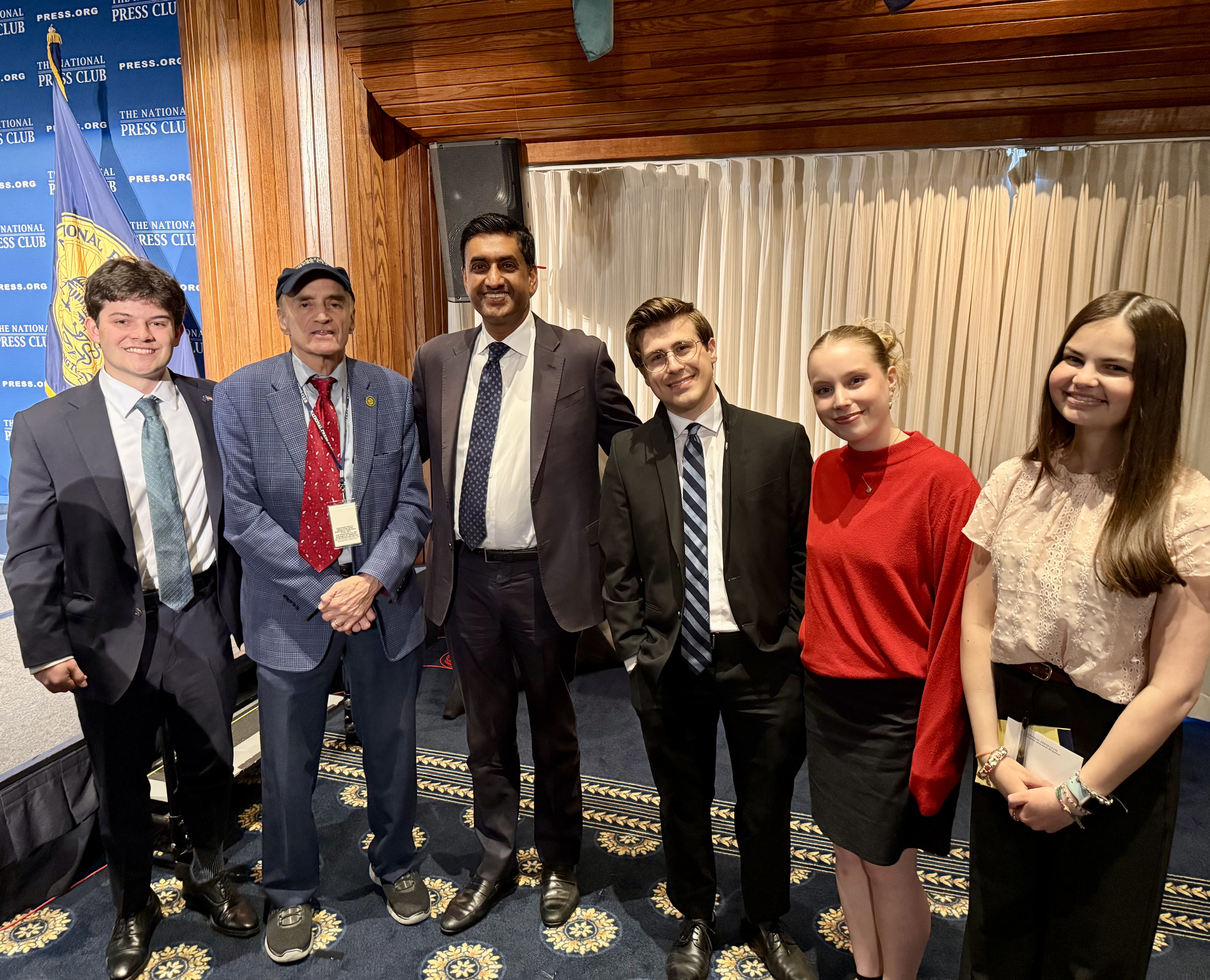 Photo: April 14, 2026 at National Press Club News Conference, L-R Griffin Cobb, Bob, Cong. Ro Khanna (Epstein Transparency Act author), Andrew Beauchamp, Lily Roberti, Emma Paris -- spring 2026 Weiner Public News/National Press Club interns/oped writers/poilicy analysts. Photo: Emma Paris: