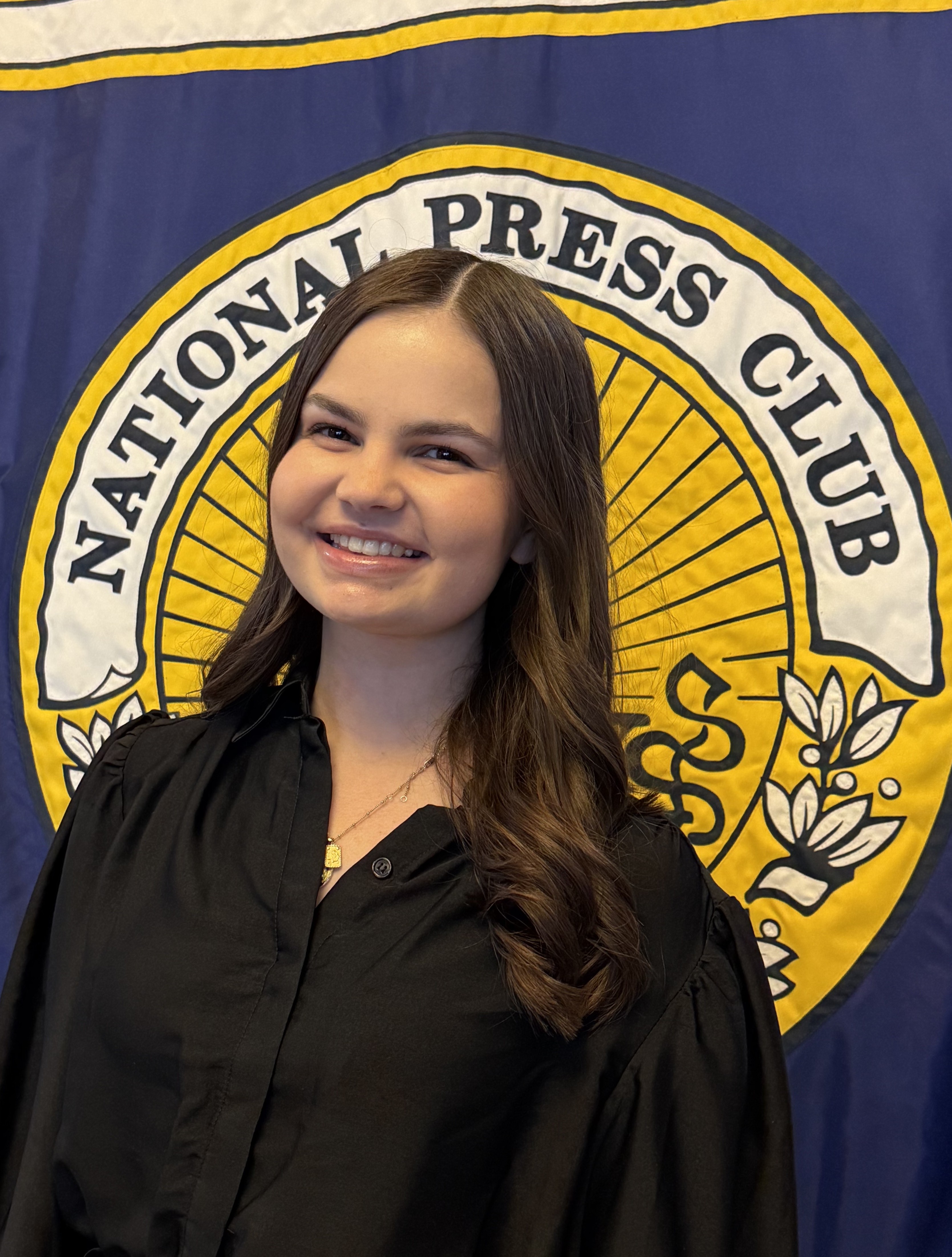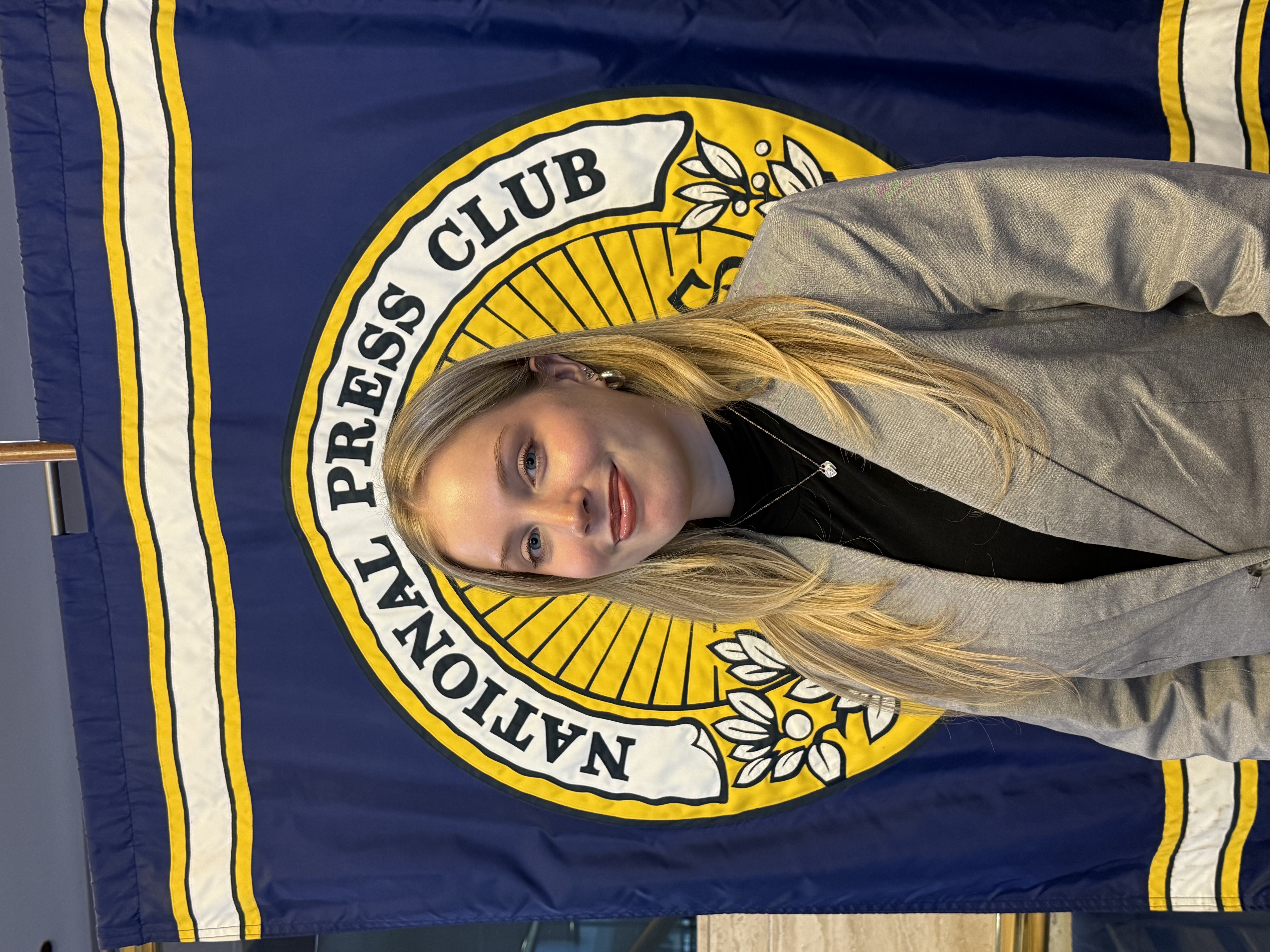 • Weiner NPC intern oped writers Summer 2024 group at NPC/National Journalism Institute Spelling Bee "Press Vs Politicians (Press won 31-30), on July 27, 2024 in National Press Club ballroom, immediately before Presidential Debate watch. Photo by Alan Kotok, National Press Club. L-R: Kailynn Bannon, Olivia Ardito, Catherine Walker, Tomas Alves, Ashleigh Fields, Jonathan Person, Dr. Patricia Berg, Bob Weiner